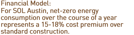 For a 1400 sq ft house this premium is about $16 per square foot or $22,400 in addition initial cost due to energy related items when compared to conventional construction. This cost premium represents about a $130 per month increase in a 30 year mortgage while the building technology is estimated to save about $160 each month in utility bills.
